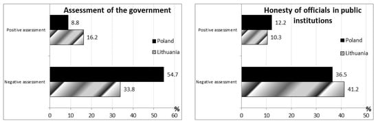 The results show (Figure 2 left panel) that the government, the public sector, and its activity, is generally negatively assessed by society, i.e., there are more negative judgments (very bad or bad) than positive ones (very good or good). This assessment is because respondents believe the government takes little action for the benefit of society or for the common good, i.e., other members of the ecosystem. There are more people in Poland (over 50%) than in Lithuania (over 1/3), who negatively assessed government activity. Moreover, respondents believe (Figure 2 right panel) that officials in public institutions are either rather dishonest or very dishonest. This is a sad conclusion; such an attitude will certainly not encourage businesses, universities, or society to cooperate with the government in implementing innovations.