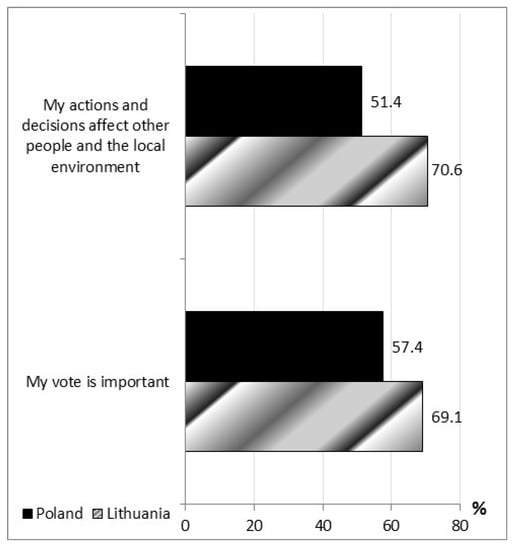 The results indicated that most of the respondents feel that they can co-determine the issues that affect them, i.e., their voice matters. Moreover, they feel that their decisions and actions have an impact on the reality in which they live. This is an important conclusion, since innovations are created for them by companies. It is also worth mentioning that a higher percentage of respondents with a positive attitude to this issue were in Lithuania (about 70%) than in Poland (51–57%).