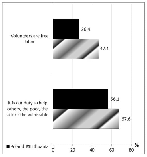 The third entity considered in the Quadruple Helix model and analyzed were companies. As companies implement innovations, they should ideally be innovations that serve society. At the same time companies, should not treat their partners, especially universities, as cheap labor forces; therefore, we investigated if the respondents (employees and company owners) agreed with the statement that it was their duty to help others, people who are poor, sick, or in a difficult life situation. Furthermore, we investigated whether companies consider volunteers as free labor. The results of this analysis are presented in Figure 4.