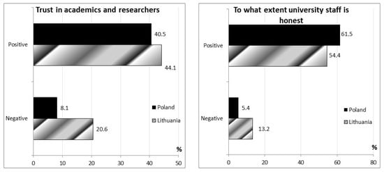 The last stakeholder analyzed was the universities and the academics working there. Since science and business should cooperate with each other, there must be trust in academics, as well as honesty and reliability. Figure 5 shows the results of answers to the question—how much trust do you have in the university’s research and teaching staff (left panel) and to what extent do you think the university staff is honest (right panel)?