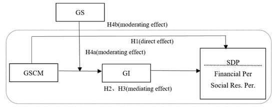 In summary, GSCM can improve the SDP of an enterprise by enhancing the GI. GS provides enterprise-level GSCM and GI with required resources and plays a role in influencing an enterprise’s reputation. In other words, enterprises convey an important signal to other stakeholders, such as the government and customers, that they are trustworthy. Therefore, this study proposes that GS affects the mediating effect of GI on the relationship between GSCM and SDP (as shown in Figure 1). Specifically, when an enterprise receives GS, the marginal effect of GSCM on GI is projected to increase, intensifying the indirect effects of GI on SDP. Based on H4a, this study further proposes the following hypothesis.