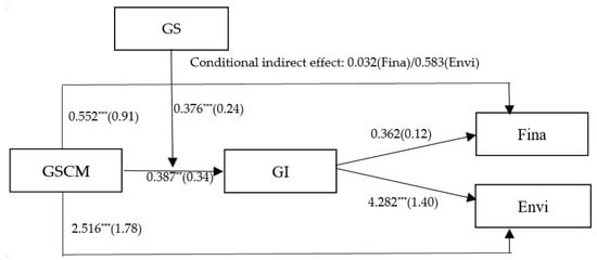 A three-procedure regression analysis proposed by Baron and Kenny (1986) [38] is used to examine the mediating effect of GI. First, this approach tests the impact of GSCM on financial performance and environmental performance. In Table 1, columns (2) and (5) show the direct effect of GSCM on financial and environmental performance. Results show that the regression coefficients of GSCM are significantly positive at the level of 1%.