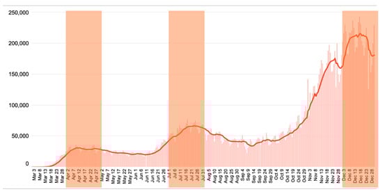 Prior to the full-fledged analysis, the status of COVID-19 during the year 2020 was reviewed, and it was confirmed, as shown in Figure 1 [41]. This plot shows the distribution of the average number of confirmed cases of COVID-19 per week, targeting the period from 1st March to 31st December 2020. What is interesting is that over time, the increase in the number of confirmed cases of COVID-19 has not taken a linear form, and the increase or decrease in the number of confirmed cases has been different. Among the different patterns of confirmed cases, the periods of April, July, and December, which are shaded, are identified as periods of a noticeable increase in the number of cases compared to the previous month of each phase. April was the beginning of the spread of COVID-19, and it appears to have increased as responses and measures have not been settled in all communities [21]. Spikes in July were due to the summer holiday season, with outdoor activities and increased leisure activities in residential areas due to quarantine [53]. The COVID-19 surge in December was caused by many exchanges over Thanksgiving, Christmas, and year-end holidays [54]. Therefore, this study was conducted for 2020, but it was reasonable to analyze the three-monthly data separately in April, July, and December without combining them in a single analysis pool, comparing the results of the three analyses to evaluate the differences in population distribution, mobility, and additional behavioral changes. For reference, each period was referred to as phase, and April was designated phase 1, July as phase 2, and December as phase 3.