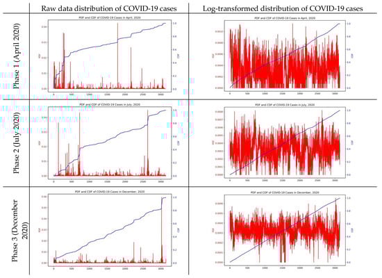 The distribution pattern of the number of confirmed cases of COVID-19, a dependent variable, has also been observed with interest. As the number of confirmed cases has not been evenly distributed across all counties—a certain number of confirmed cases have been found in specific counties—it is difficult to achieve high classification accuracy if the collected number of the COVID-19 confirmed cases is used as it is in the analysis. The distribution of probability distribution function (PDF) and cumulative distribution function (CDF) in the three phases presented to the left column of Figure 2 shows that the number of observations is concentrated in the interval of particular values.