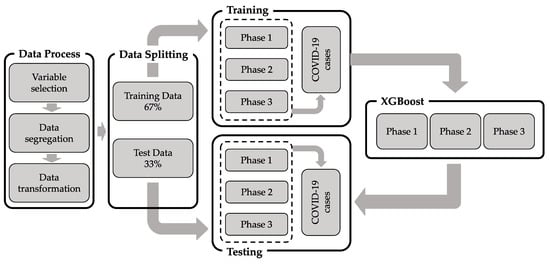 The relationships between independent variables and the confirmed COVID-19 cases were examined through the XGBoost model. Since the XGBoost model focuses on classification, it is appropriate to find the specific independent variable and its level. The dependent variable can be classified most efficiently and accurately, rather than predicting parameters by finding the relationship between the independent and dependent variables. Therefore, we analyzed the data prepared earlier and presented key variables and variable-specific levels in predicting and classifying the increase in new confirmed cases of COVID-19 for each phase. The accuracy of the predicted model for each phase was analyzed before identifying the characteristics of the key variables for each phase.