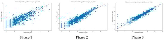 To determine the accuracy of the XGBoost model, we compared the observations and predictions used in the test on the graph to determine the performance plots representing them, as shown in Figure 4. It is found that the overall shape of the scattered data is distributed according to the linear form of the right-up side, indicating that the distributions of the observations (x-axis) and the predictions (y-axis) have similar shapes. This means that the prediction of the number of new confirmed COVID-19 cases predicted by phase is correct. In addition, as the phase progresses, the variance of the data decreases, and it can be seen that it is clustered close to the trend of the alignment. This means that the relationship between observed and predicted values is more accurate. Moreover, the results of each phase’s model were identified and compared with the following Table 2 by adopting the metrics including residual mean squared error (RMSE), R-squared, and explained variance score. The shape of each phase-specific prediction model previously observed through Figure 4 can be quantitatively identified in Table 2.