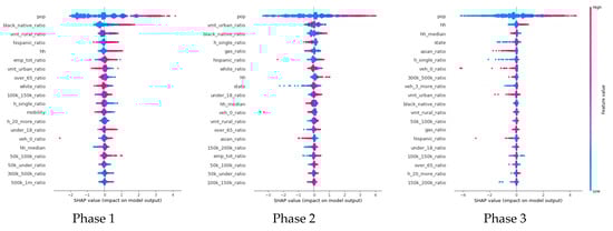 The relationship between the number of newly confirmed COVID-19 cases in the U.S.A. and variables structured in multi-level panel format of demographic, mobility, and behavioral characteristics were explored using the XGBoost model to analyze urban context at county level. Rather than analyzing 2020 through a single temporal window, three distinctive phases were segmented, analyzed, and compared through a phase-specific model. This revealed differences of VI by phase, as shown in Table 3, that could not be confirmed if the entire year was analyzed. Given the nature of the COVID-19 with contactless infection characteristics, the positive relationship of the number of new confirmed cases by population size identified in all phases is judged by reasonable analysis results. In addition, the relationship between the VMT ratio in the rural area identified in phase 1 and the VMT ratio in the urban area identified in phase 2 also illustrates the national response and the change in resident behavior as the number of confirmed cases increases. Additionally, the detached houses as a type of housing unit, a variable identified during phase 2 when active outdoor activities are expected in summer, which is negatively related to the increase in the number of confirmed people, are well explained. The fact that variables such as population and number of households were significantly identified in phase 3 due to active year-end family and relatives meetings that began with Thanksgiving can also be judged that the model reflected people’s behavior. Unfortunately, in phase 1 and 2, racial characteristics have been identified as variables of high importance with a positive relationship. This has already been confirmed in previous studies.