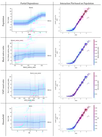 In phase 1, population (pop), ratios of Black Native (black_native_ratio) and rural VMT (vmt_rural_ratio), and Household (hh) were expected to be important. These variables can be summarized in Figure 6 by representing a partition plot that shows the degree of influence on the number of new cases of COVID-19 by variable and an interaction plot that indicates the interrelationship of variables. First of all, in the partial dependence presented on the left, it can be observed that in population, if more than 10,000 people—the value shown on the axis is log-transformed—the number of new confirmed cases is starting to increase. The relationship with the Black Native ratio can be seen to increase continuously. Furthermore, the VMT in the rural area shows a significant increase in the number of confirmed cases if it is more than 70% compared to 2019. Looking at the relationship between variables based on population, we can see that Black Native has a weak positive relationship in population size, and rural VMT is generally evenly distributed but has a weak negative relationship and a perfect positive relationship with household.