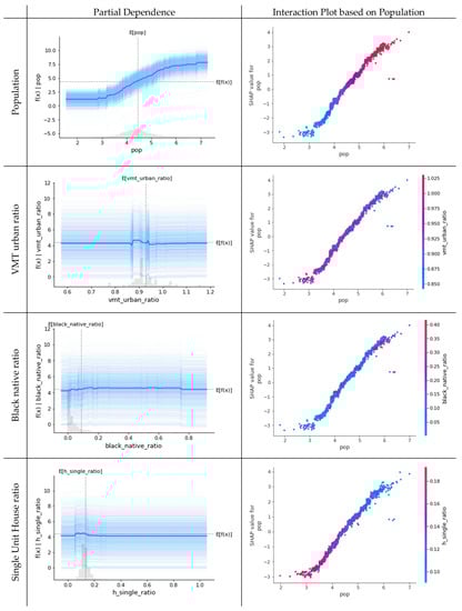 The relative variable importance and variable properties can be combined to represent each variable’s contribution, with observations and Shapely value observations sorted by variable importance, respectively, in different colors and values on the x-axis. In addition, the average marginal change can be determined by plotting the observed value on the x-axis on the y-axis for each variable, thereby determining the relationship between that variable and the predicted value of the model. Thus, this work seeks to analyze the behavior and interrelationship of urban residents and elements by identifying the importance ranking of independent variables for each model through visual analysis of the relative variable importance, partial dependence, and interaction plots.