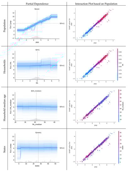 In phase 3, population (pop), household (hh), household median age (hh_household), and state (state) were expected to be important, and dependence plots and interaction plots could be found in Figure 8. The pattern of increase in the number of confirmed cases following population size was more vicious than phase 2, and the increase was also confirmed in counties with smaller population sizes. This is reasonable given the trend in December, when the number of confirmed COVID-19 cases is the highest of 2020, to disprove the discovery of confirmed cases across almost every country. What is interesting about phase 3 is that it is difficult to find a noticeable level of variable in increasing the number of confirmed cases in other variables except population. The spread of COVID-19 is at its peak, and it is believed to be showing this pattern of influence because it has already become a global phenomenon. For the relationships between variables based on population, it can be judged that households are evenly observed across the board. The median age of a household is negatively related to population size. They have indiscriminate relationships on a weekly basis and affect the number of confirmed cases.