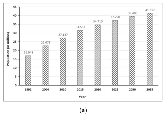 Urbanization is a phenomenon that involves urban areas growth, population growth, an increase in built-up areas, and a high density of the population [1]. About 54% of the world’s total population lives in urban areas, and the urban population around the world has grown rapidly from 746 million in 1950 to 7.8 billion in the year 2020 and is expected to be stand at between 9.4 and 10.2 billion by 2050 [2]. Recently, Saudi Arabia has witnessed a population growth throughout the last forty years, and this continues to increase due to the rapid economic development. Meanwhile, the discovery of oil in 1960s in Saudi Arabia had resulted in an increase in the urban development and accelerated urban area growth [3]. According to Saudi General Authority for Statistics, the population size in Saudi Arabia increased from 5.8 million in 1950 to 9.8 million in 1980, 31.5 million in 2015, and 34.7 million in 2020. Moreover, the population is projected to be 37.2 million, 39.4 million, and 41.3 million in 2025, 2030, and 2035, respectively [4]. Figure 1 shows the population growth in Saudi Arabia. Furthermore, nearly 80% of Saudis live in major urban centers such as Ar-Riyadh, Jeddah, Holy Makkah, Al-Madinah Al-Munawwarah, Al-Hofuf, Al-Taif, Al-Khobar, Yanbu, Dhahran, and Ad-Dammam [5]. The socio-economic data obtained from the Saudi General Authority for Statistics indicate that Ar-Riyadh’s has witnessed population growth from 5.6 million in 2013 to 7.6 million in 2019, and the urban areas have expanded nearly three-fold in size, whereas Jeddah has undergone significant population growth from 3.9 million in 2013 to 4.5 million in 2019, and the urban areas have grown over two-fold. Meanwhile, the population in Ad-Dammam has witnessed little growth, from 1 million in 2013 to 1.2 million in 2019.