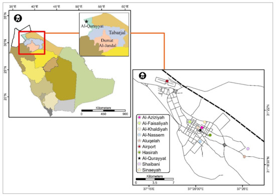 Al-Qurayyat City is the headquarters of the Emirate of the Al-Qurayyat Governorate and is located in the far northwestern part of the Kingdom of Saudi Arabia, and is about 30 km from the border with Jordan. The Al-Qurayyat governorate is situated in the Al-Jawf region, which includes two other governorates, namely Dumat Al-Jandal and Sakaka. The Al-Qurayyat governorate has a strategic location, as it is located on the international road linking Saudi Arabia with Jordan. It is bounded by the Al-Hudud Ash Shamaliyah region to the east, the Sakaka governorate and Tabuk region to the south, and Jordan to the north and west. Al-Qurayyat City is a newly established city that was established in 1937 after the discovery of oil, and before that, it was a residential area for some Bedouins and was a resting place for pilgrims coming from the northern part of the Kingdom [37]. The city had a population of 308,151 according to the Saudi Census in 2020. Al-Qurayyat City is about 1200 km from the capital of Riyadh, about 310 km from Sakaka City (headquarters of the Emirate of the Al-Jawf region), and about 350 km from Arar City (headquarters of the Emirate of the Al-Hudud Ash Shamaliyah region). It is located between the latitudes and longitudes of 31°19′46.69″ and 31°31′33″ N and 36°30′45.7″ and 37°21′40.87″ E, respectively, as shown in Figure 3. Al-Qurayyat City is covered with natural pastures which are mainly used for grazing. The soil is saline, which is why it has been called the land of salt and is known for its olives, and its agriculture is based on olive cultivation. Its industrial activities rely on the extraction of olive oil, in addition to the canning of both salt and olives.
