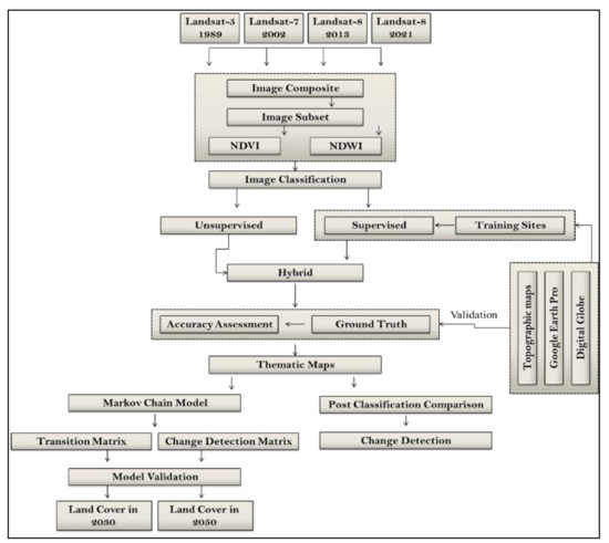 The challenge that many researchers face is selecting the most proper and the optimal classification algorithm. Although both the unsupervised and supervised classification algorithms may be used, the supervised achieve superior in spectral class differentiation and offer the highest accuracy. The maximum likelihood supervised algorithm was selected to extract land use/land cover maps in this study due to its better results in similar research beyond its wide application in remote sensing studies. Additionally, the maximum likelihood classifier is principally controlled by the analyst in the selection of the pixels that are representative of the available land use/land cover classes.