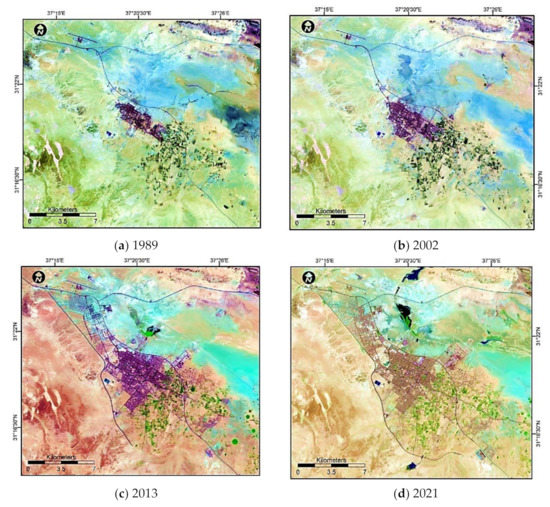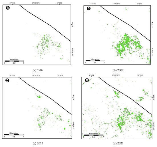 Green cover in the study area, as seen in Figure 6, was sparse and almost nonexistent, except in the southeast regions in 1989 and 2013. In 2002, the green cover was less than other years due to the olive harvesting, which starts in late of August. The Saudi government expanded the large-scale cultivation of olives agriculture significantly, as seen in Figure 6d. The Al-Jawf region as a whole and Al-Qarrayat City itself are considered the pillar of Saudi olive cultivation.