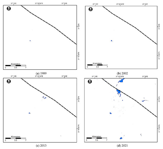 Water surfaces in Figure 7 were almost nonexistent in 1989, 2002, and 2013, whereas in 2021, the water surfaces, whether clean or turbid, increased through sewage estuaries and open surface water tanks.