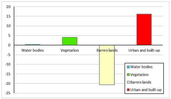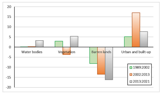 The post classification comparisons were applied to extract the land use/land cover changes between classified image pairs: 1989–2002, 2002–2013, and 2013–2021. The post-classification is one of the most commonly used methods in change detection [46]. Post-classification permitted the extraction of the ‘from–to’ land use/land cover change matrix during the four epochs. Figure 9 presents the total losses and gains in land use/land cover from 1989 to 2021. Inspection of Figure 9 reveals significant changes in the barren land in addition to urban and built-up areas. Rapid urban growth impacts the soil quality and is considered one of the most significant mechanisms of the degradation of fertile soil [47,48]. The extensive urban growth led to negative impacts on agricultural production, which resulted in the reduction in soil fertility, loss of agricultural variation and quality of crops. Additionally, rapid urban growth would affect the hydrogeological instability and causes the loss of biodiversity, green areas, low carbon stocks in soil, in addition to raising the costs of energy services [49,50]. Thus, widespread urban growth is considered a main cause of the long-term dynamics of soil consumption and erosion [51]. Briefly, it can be said that the sprawl urban growth is interconnected with changes in soil consumption that are closely related to changes in the biodiversity and ecological features, and thereby impact the sustainability [52].