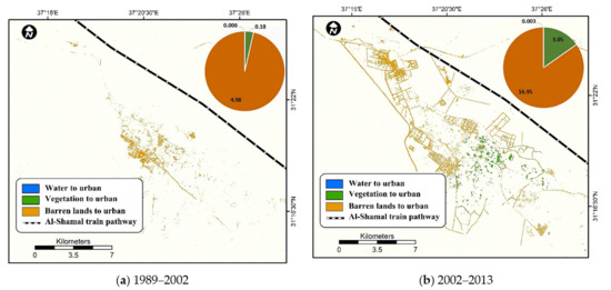 Table 6 illustrates that during the 1989 to 2002 epoch: (1) no losses occurred in water areas and 0.09 km2 were gained from barren land. (2) The vegetation class lost about 3.73 km2–3.55 km2 were converted into barren land and 0.18 km2 were converted into urban and built-up areas. (3) The vegetation class gained 22.96 km2 from barren land. (4) Barren lands lost 3.55 km2 due to the conversion to vegetation and urban and built-up classes, respectively. (5) Barren land gained 27.76 km2 converted from the vegetation class. (6) The urban and built-up class gained 5.16 km2 from the vegetation classes (0.18 km2) and barren land (4.98 km2).