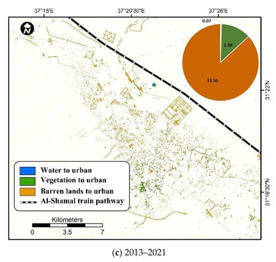 Table 8 shows the changes in land classes from 2013 to 2021, where about 0.29, 4.78, 31.79, and 7.40 km2 were lost from the water, vegetation, barren lands, and urban and built-up classes. Furthermore, 3.49, 17.11, 11.05, and 15.61 km2 were gained from the same classes, respectively. Figure 10 shows the post classification comparisons between image pairs, demonstrating the temporal and spatial changes from 1989 to 2002, 2002 to 2013, and 2013 to 2021. It is clear that the main transitional changes are from barren lands to the urban and built-up areas due to the increased and rapid urban expansion.