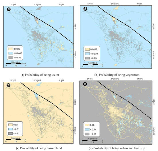 - The conditional probability images (transition maps) of land cover classes. These maps demonstrate the probability that each pixel will be converted to another land cover class in the next time period.