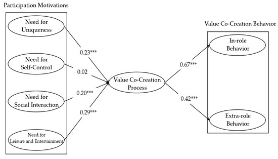 Table 2 shows the significant correlations among all constructs. Reliability was examined with Cronbach’s alpha and CR. The results of Cronbach’s alpha showed internal consistency of the scales []: need for uniqueness (0.87), need for self-control (0.90), need for social interaction (0.93), need for leisure and entertainment (0.83), VCCP (0.87), in-role behavior (0.89), and extra-role behavior (0.88). CR values for all constructs were above 0.70, satisfying construct reliability [].
