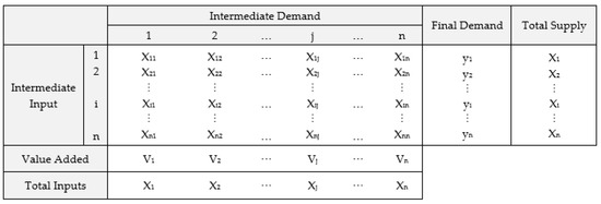 A row of an input–output table shows the product in industry i sold to industry j. The sales structure is divided into intermediate and final demand. The total demand is the sum of intermediate and final demand, and the total output is income deducted from the total amount of demand (Figure 1).