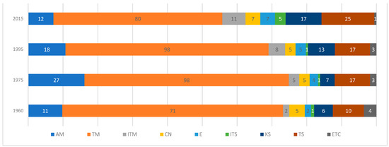 This study used input–output tables, based on current market prices in the relevant year, for 1960, 1975, 1995 and 2015 from the Bank of Korea [54]. To compare the 4-year input–output tables, this study eliminated the nominal increment by inflation by applying the GDP deflator using the index with 2015 as the base year provided by the Bank of Korea (Table 3). To analyze the ecosystem of smart city industries with the 4-year input–output tables applying the GDP deflator, sub-subcategories that are the minimum unit of each industry were reclassified into nine industries: Agriculture and Mining (AM), Traditional Manufacturing (TM), IT Manufacturing (ITM), Construction (C), Energy Supply (E), IT Services (ITS), Knowledge Service (KS), Traditional Services (TS) and other unclassified (ETC).