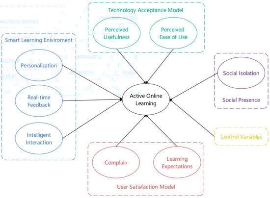 Numerous studies have mentioned the help of personalization, intelligent interaction, and timely feedback in smart learning environments approach the quality improvement of learning [37,44,45,46], and found that perceived ease of use and perceived usefulness are essential influences on learning satisfaction [27,43,47,48], proving the impact of social isolation on online learning [49,50,51]. However, few studies have integrated the effects of the wisdom learning environment, perceptions of the learning environment, and social isolation on active learning online.