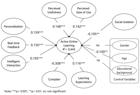 This study used SmartPLS 3 to build and analyze the model [90,94], and the sample size of bootstrapping was 5000 to calculate the significance of paths. Figure 2 shows the r study results on active online learning of PLS-SEM by university students.