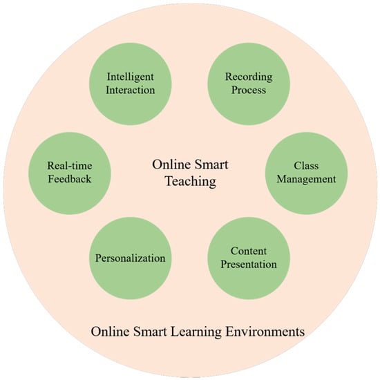 E-learning can be divided into synchronous and asynchronous according to time, and the learning space corresponds to synchronous and asynchronous online classrooms, respectively. Whether in synchronous or asynchronous classrooms, intelligent interaction, real-time feedback, and personalization should be the fundamental elements teachers must consider when building an online learning environment. With technology development, more and more learning management systems (LMS) provide well-designed interaction, feedback, and personalization tools. Teachers should implement information technology and deeply integrate the relevant technological functions with the teaching methods to build a smart learning environment. Figure 3 shows the proposed Online Smart Teaching Model, which includes intelligent interaction, real-time feedback, personalization, content presentation, and classroom management. Content presentation, class management, and recording process are six aspects that facilitate teachers’ online smart learning environment. Content presentation refers to presenting teaching content in different teaching methodologies and solving vital and challenging class problems. Class management means that teachers can understand students’ learning status in real-time through the platform to provide targeted tutoring to an individual student. The recording process represents that the whole process of students’ learning is recorded by the system, and targeted learning analysis can be taken.