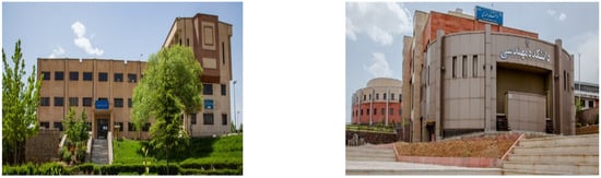 The case study, the University of Kurdistan (UOK), is located in the south of Sanandaj city, Kurdistan province, Iran. The UOK is located at a latitude of 35°16′ North and a longitude of 46°59′ East. It is one of the largest universities in the West of the country. The UOK campus has a total area of 101 ha (hectare) and includes seven faculties, three dormitory building blocks, two restaurants and cafeterias, several office buildings, a central building of classes (Gollan Building), several amphitheaters, several labs, outdoor/indoor sports centers, and two central libraries. The mean population (students and staff) during the four years of research was about 9982 people. In Figure 1 two faculties at the UOK are shown (left: the Faculty of The Literature and Languages; right: the Faculty of Engineering) as an example.