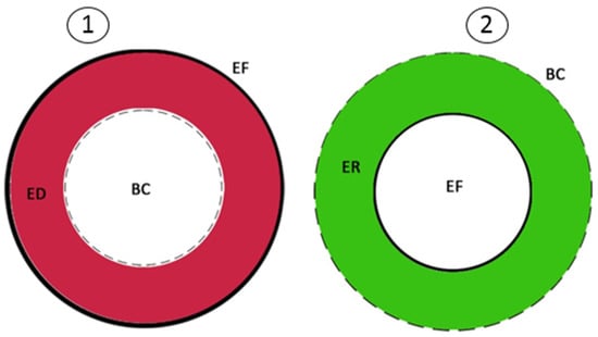 The Ecological Deficit (ED) indicates that the ecological resilience capacity is insufficient, whereas the Ecological Remainder (ER) indicates that the ecological capacity is surplus, i.e., more than the resource consumption and the amount of waste neutralization. This concept is illustrated in Figure 3.