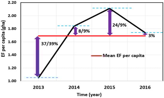 Figure 4 shows that the performance of the UOK campus in terms of EF per capita from 2013 to 2016 is not sustainable. In the first academic year (2013), the EF per capita was 1.05 gha, while the mean EF per capita was 1.69 gha. The highest EF per capita was observed in 2015 (2.11 gha), whereas the EF per capita in 2014 was 1.84 gha. In 2016, it was 1.74 gha. The percentage annual EF difference with the mean EF is presented in Figure 4. The results show that it is not logical to rely on data for one year for EF assessment as well as interpretation of the sustainability of a society. The EF of 2013 was much lower than that for the other years. The main reason relates to several construction projects such as the Central Services Office, Faculty of Art and Architecture, and renovation of Faculty of Humanities and Social Sciences, which were started in 2014 and continued until 2016.