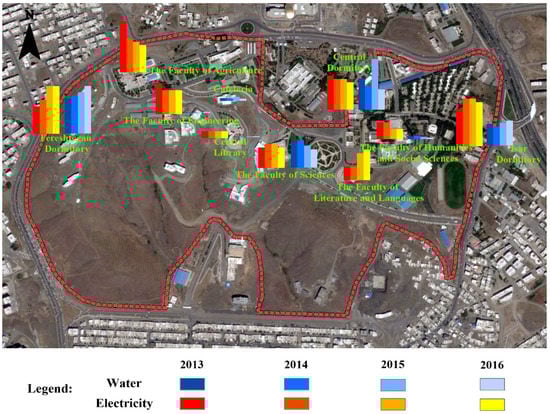 The result of electricity and water EF at the building scale over four years, 2013–2016, is presented in Figure 6. It can be observed where and when the electricity and water at the UOK campus had the most and least amount of EF per capita. This analysis does not include the natural gas consumption because the breakdown data of gas consumption at the building scale was not available.