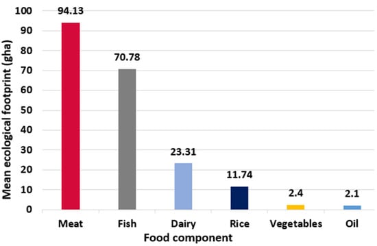 The food component consisted of meat, fish, rice, vegetable, dairy, and oil usage. The mean (2013–2016) EF of food usage at the UOK was 204 gha (Table 6). Figure 7 shows the six categories of food usage. The highest EF belonged to meat usage (94.13 gha), whereas the lowest EF belonged to oil usage (2.1 gha).