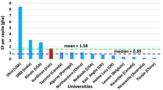 The EF of the UOK campus over four academic years was analyzed and the results such as mean EF per capita (1.69 gha per capita) during this period were compared with other studies. At the UOK, the total EF (16,484 gha) is high in comparison with the EF of most other universities. In some cases, it was five times higher (Figure 9).