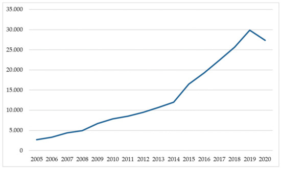 Annual number of publications between 2005 and 2020 referring to the topics “Sustainable Development” or “Sustainability” (title, keywords, abstract). Source: Own elaboration with data from Web of Sciences.