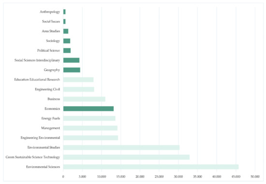 Disciplinary assignments of publications containing the topics “sustainable development” or “sustainability” between 2005–2020. Source: Own elaboration with data from Web of Sciences. Dark green bars highlight social sciences disciplines.