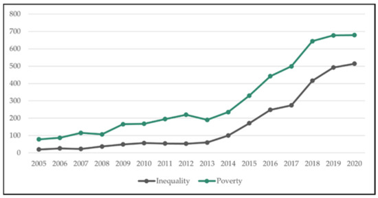 Publications in all disciplines containing the topics “sustainable development” and “sustainability” and “poverty” or “inequality”, 2005–2020. Source: Own elaboration with data from Web of Sciences.