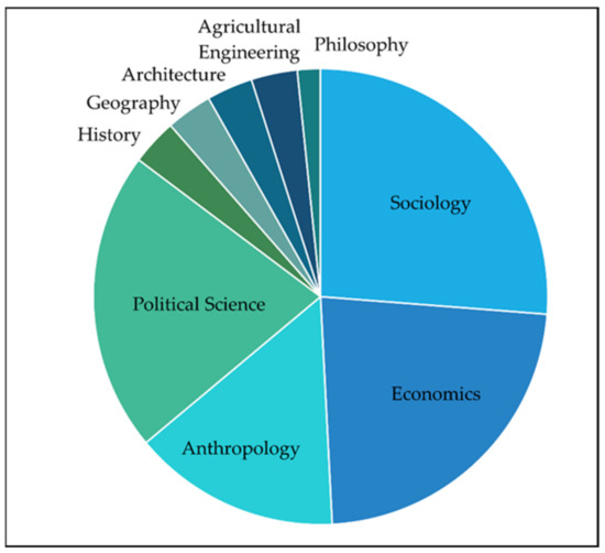 Teaching staff from different disciplines ensure the interdisciplinary character of the curriculum. All of the lecturers invited to the program addressed issues of sustainability and sustainable development from their respective disciplinary position but with a focus on the causes and effects of social inequalities on sustainability. Between 2017–2020 a total of 61 researchers lectured in the two courses offered in 2017 and in 2019. In detail, the two students’ cohort of the program (from 2017–2018 and from 2019–2020) received lectures from 14 economists, sixteen sociologists, thirteen political scientists, nine anthropologists, two lecturers from architecture, agricultural engineering, geography, and history and one lecturer from philosophy (Figure 4).
