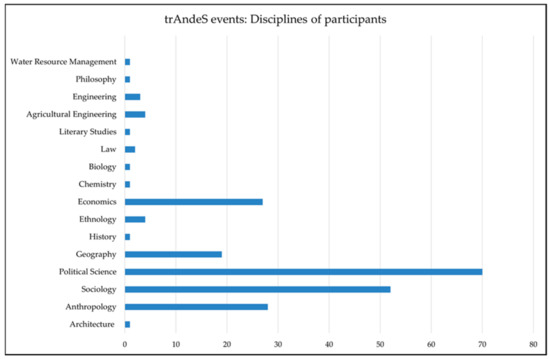 Disciplinary composition of active participants in major academic events organized by trAndeS between 2016 and 2019 (11 events with 217 participants). Source: own elaboration.