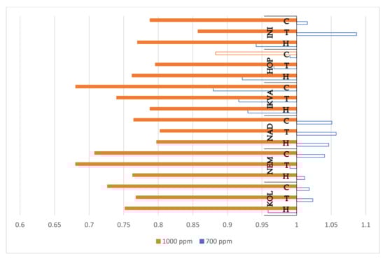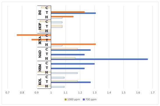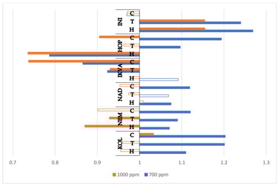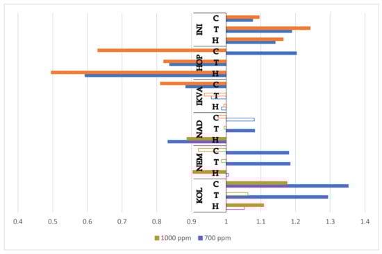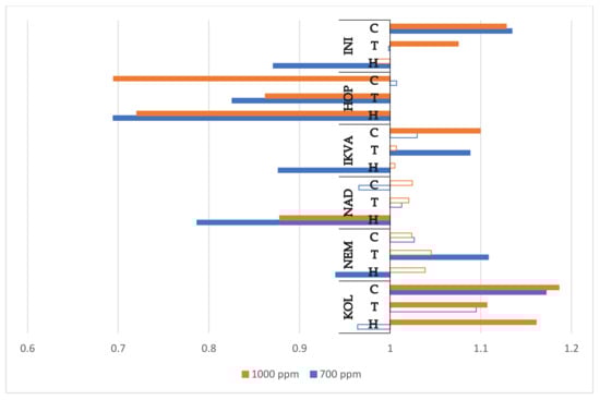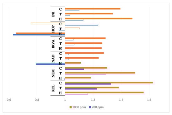 Relative changes in cultivars in response to elevated CO2 in terms of biomass; ‘C’: control treatment; ‘T’: drought stress at tillering stage; ‘H’: drought stress at heading stage. ‘INI’: Mv Initium, (winter barley); ‘HOP’: Mv Hópehely (winter oat); ‘IKVA’: Mv Ikva (winter wheat); ‘NAD’: Mv Nádor (winter wheat); ‘NEM’: Mv Nemere (winter wheat); ‘KOL’: Mv Kolompos (winter wheat). Full bars represent significant differences compared to the control (400 ppm) p ≤ 0.05 level (n = 3).