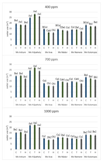 Average water use values (m3) of the tested varieties. ‘C’: control treatment; ‘T’: drought stress at BBCH 21; ‘H’: drought stress at BBCH 55. Capital letters indicate the statistical significance between the varieties; lowercase letters indicate the statistical significance between the treatments; the numbers show the statistical significance between the different CO2 levels at p ≤ 0.05 level (n = 3) (Mv Initium is winter barley; Mv Hópehely is winter oat; Mv Ikva, Mv Nádor, Mv Nemere and Mv Kolompos are winter wheat).