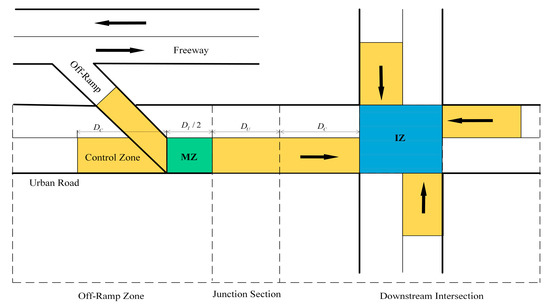 As shown in Figure 1, a typical integrated freeway off-ramp and urban road network structure contains three zones: the Off-Ramp Zone (ORZ), the Junction Section (JS), and the Downstream Intersection (DI). Vehicles coming from both the freeway and the urban road network merge in the Merging Zone (MZ), which is located at the ORZ. The JS contains both the ORZ and DI. The DI is a typical urban intersection, the center of which is defined as the Interweaving Zone (IZ).