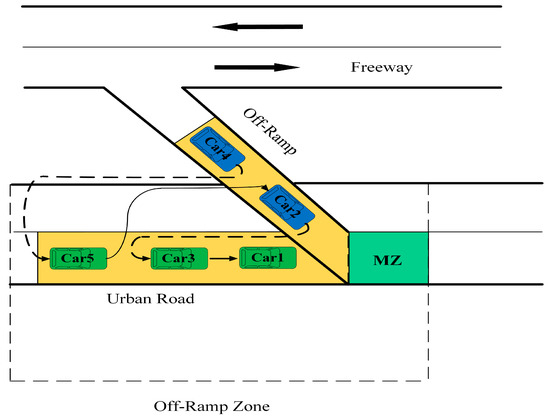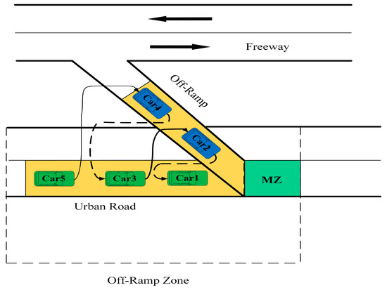 Regarding ORZ, most research adopts the principle of “arterial road first”; that is, vehicles from the off-ramp give priority to those from the main roads. Based on this rule, the corresponding control methods are developed to optimize the vehicle trajectory from the off-ramp to improve the merging efficiency in the MZ. These methods are advantageous to ensure the continuity and efficiency of traffic flow to some extent. However, it would cause serious traffic delays on the off-ramp.