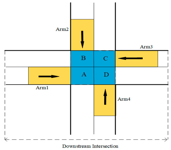 Note that at the ORZ, vehicles with merging conflicts are not allowed to enter the MZ simultaneously, which guarantees driving safety. However, we could not have the same constraint at the DI, as it would waste a lot of time in the system. Due to the fact that the width of the IZ is twice that of the MZ, assuming that the vehicle passes at the same maximum speed, the time needed to pass through the IZ will also be double that of passing through the MZ, which greatly reduces the traffic efficiency. Here, a road meshing method to determine the vehicle passing sequence in the IZ is developed. As shown in Figure 4, the IZ is meshed into four areas of the same size, which are named A, B, C, D in clockwise order. The four entrance arms of the intersection are also ordered in clockwise order, namely from Arm 1 to Arm 4. The travel time of each area is equivalent, e.g., the time that a vehicle coming from Arm 1 to Area A is equal to the time from Arm 2 to Area B. Furthermore, it can be found that even if the vehicle from Arm 1 and another vehicle from Arm 2 arrive at the IZ at the same time, the two vehicles can enter the IZ synchronously without any safety conflicts. According to this characteristic, we can infer that even vehicles coming from the four arms can be allowed to enter the IZ synchronously, which can greatly improve traffic efficiency.