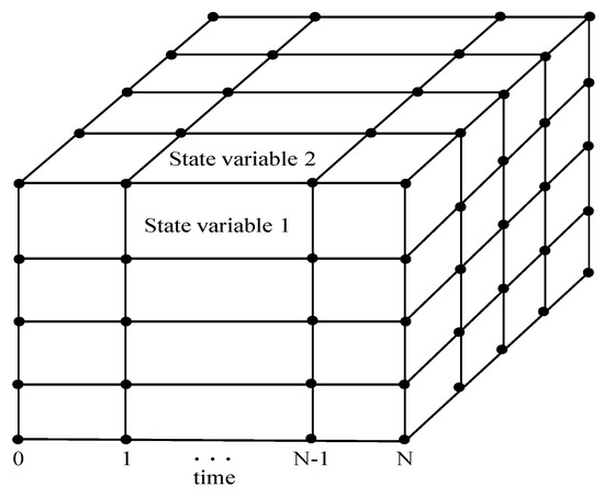Assuming that the number of the stage (or number of discrete time points) is N, it needs to calculate the performance index time at each state. Figure 5 shows the storage capacity of the two-dimensional state space. It indicates that the amount of data is the “Curse of Dimensionality” [41]. Though several theories have been applied to optimize such problem, including Adaptive Critic Design [42] and Neuro-Dynamic Programming [43], that is not in the scope of our research. Instead, Pontryagin’s Minimum Principle (PMP) provides us with a more convenient method to complete the solution.
