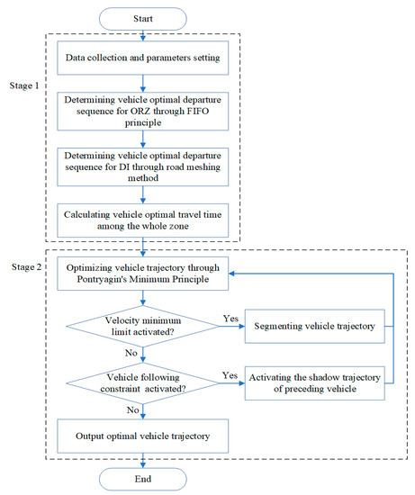 Figure 6 shows the control structure of the proposed CAV trajectory optimization strategy. The control process consists of two stages, including vehicle travel time determination and vehicle trajectory optimization. In Stage 1, different vehicle travel time determination methods are applied to determine the vehicle’s optimal departure sequence and time considering the different topological structures of the subarea. The optimal vehicle trajectory is calculated through PMP in Stage 2.
