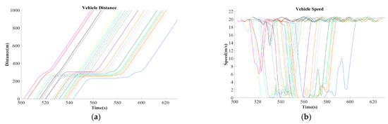 As shown in Figure 8, the vehicle trajectory controlled by the CACC strategy is smoother than the benchmark, and fewer vehicles need to stop. However, Figure 8a shows fluctuations still exist at the position of 700 –730 m. This is mainly because of the dramatic increase in vehicles at the IZ. Figure 8b also implies this characteristic at about 550 s, when the speed of some vehicles drops to almost 0 to give way to the vehicles coming from other roads. Even though the vehicles can communicate with each other to adjust their trajectory in a timely manner, this strategy cannot handle this situation well when the number of vehicles increases dramatically.