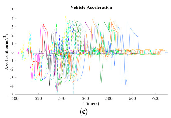 Figure 7 indicates that the trajectory profiles fluctuate frequently, especially near the MZ. This is because the MZ is a critical bottleneck of the junction. When the two traffic flows merge, it will inevitably cause serious congestion if appropriate control measures are not taken. As shown in Figure 7a, most vehicles must stop at the upstream portion of the MZ and must wait a longer time before crossing the area. However, it also that shows such vehicles need almost no waiting to pass the IZ. This has to do with the passing rules of the roads we set. The passing rule of the IZ is set as “main road priority” (vehicles coming from Arm 2 and Arm 4 should make way for these cars from Arm 1 and Arm 3). Even so, as shown in Figure 7b,c, many vehicles still need to accelerate and decelerate frequently, and the deceleration boundary value even reaches .