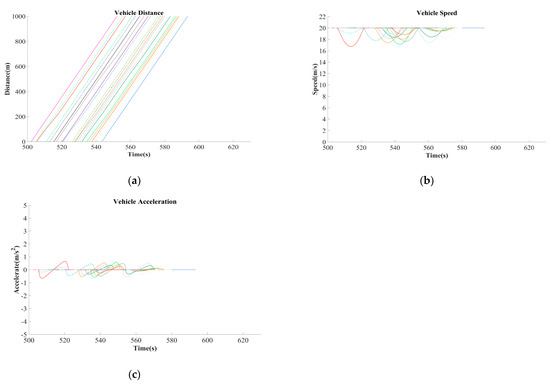 According to Figure 9, we can find that each vehicle trajectory under the control of the proposed strategy is smooth. Vehicles from both off-ramp and urban road interflow are orderly at MZ and travel along the urban roads. Furthermore, these vehicles are hardly affected by the vehicles coming from the secondary roads (Arm 2 and Arm 4) at the IZ. This benefit is from the determination of the optimal travel time that we employed. Each vehicle can travel among the whole area with relatively high speed (all higher than ), which is clearly manifested from Figure 9b. It should be noted that it seems that there are less than 25 vehicle speed profiles in Figure 9b. This is because several vehicles can maintain the desired speed at all times, so these profiles overlap. Additionally, Figure 9c shows that the change in vehicle speed is small; in other words, the acceleration and deceleration process is unabiding. Even the speed when vehicles travel near the merging zone or interweaving zone is high, which means such strategy eliminates the stop-and-go phenomenon caused by the complex traffic behavior of intersection or confluence areas.